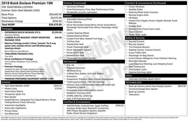 Powered by a robust 3.6L V6 engine with All-Wheel Drive, the 2018 Enclave Premium Group delivers an exceptional blend of performance and efficiency, with an EPA-estimated 25 MPG on the highway. Its sleek and refined exterior, complemented by the Satin Steel Metallic Gray paint, exudes a sense of sophistication and command.