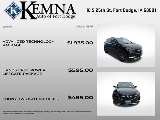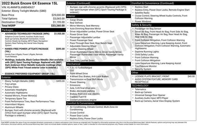 Discover the exceptional 2022 Buick Encore GX Essence, a versatile and technologically-advanced crossover that seamlessly blends style, comfort, and performance. This meticulously maintained local trade-in boasts a sleek Black exterior, complemented by a range of premium features that elevate the driving experience.- LOCAL TRADE**- ADVANCED TECHNOLOGY PACKAGE- HANDS-FREE POWER LIFTGATE PACKAGE- Preferred Equipment Group 1SLThe Encore GX Essence is equipped with an ECOTEC 1.3L Turbo engine, delivering a responsive and efficient performance with an impressive 29 city / 32 highway MPG. Indulge in the convenience of the hands-free power liftgate, the clarity of the Head-Up Display, and the connectivity of wireless Apple CarPlay and Android Auto. Experience the added security of advanced safety features like Adaptive Cruise Control, HD Surround Vision, and Rear Park Assist.Elevate your driving experience with the Encore GX Essence's premium amenities, including an 8-way power driver's seat, heated steering wheel, and dual-zone automatic climate control. The leather-appointed seating and Bose premium audio system create a refined and immersive cabin environment, ensuring your every journey is a pleasure.This exceptional Encore GX Essence is the perfect blend of style, technology, and versatility. With its well-equipped and meticulously maintained condition, it's an exceptional value proposition that deserves your attention. Schedule a test drive today and discover the exceptional driving experience that awaits you.
