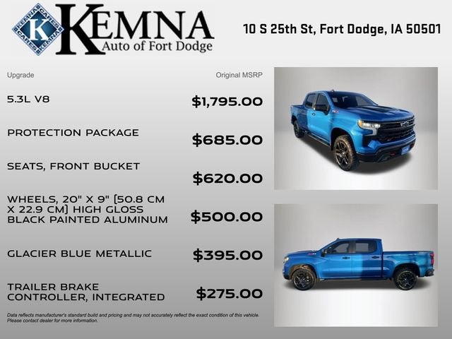 With its striking Glacier Blue Metallic exterior and high-gloss black painted aluminum wheels, this Silverado LT Trail Boss makes a bold statement on the road. But don't just take our word for it – experience the difference for yourself. Visit our showroom today and let us demonstrate how this exceptional truck can transform your driving experience.